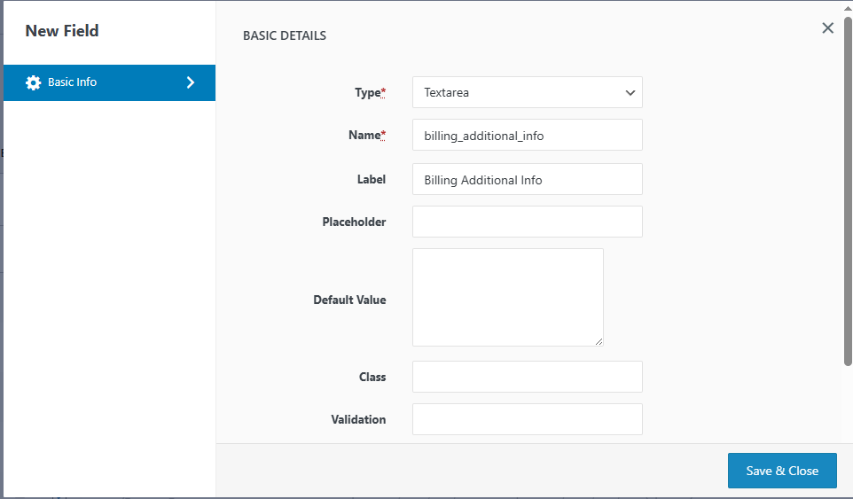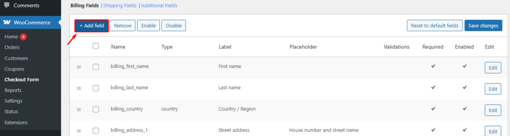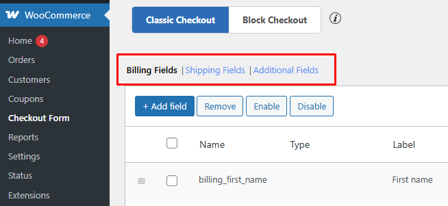 - You will see three tabs at the top: Billing Fields, Shipping Fields, and Additional Fields.