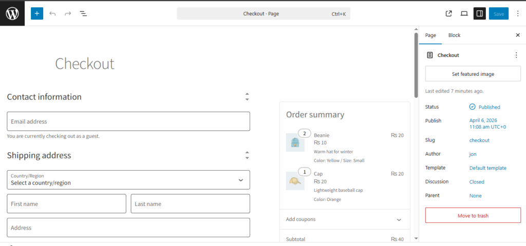 - You will see the entire checkout layout rendered as a single, smart WooCommerce block on your screen.