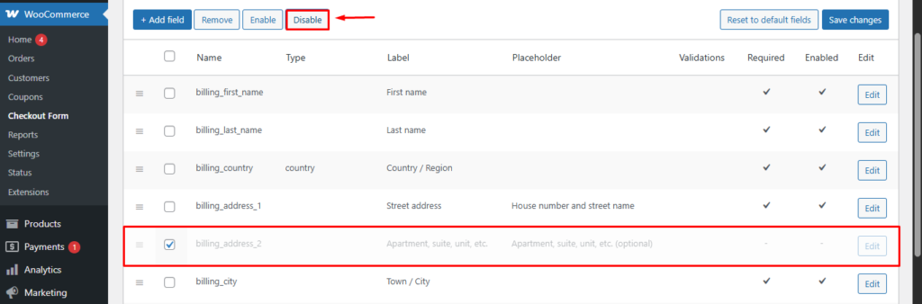- To remove a field, simply check the box next to it (like “Billing Address 2”) and click the Disable button.