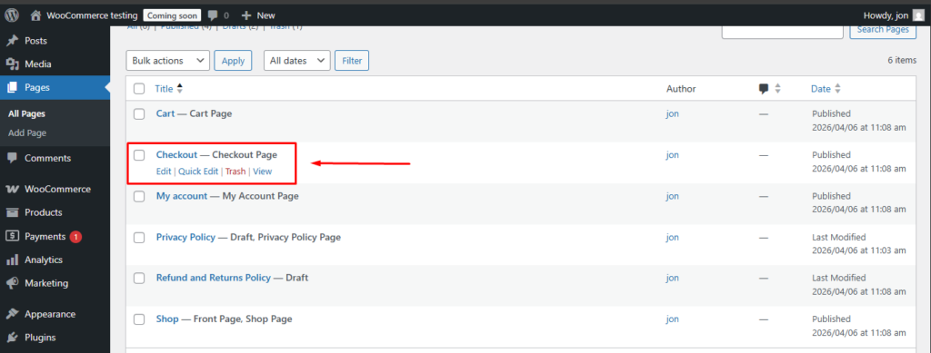 - In your WordPress dashboard, navigate to Pages > All Pages and look for the page titled Checkout.