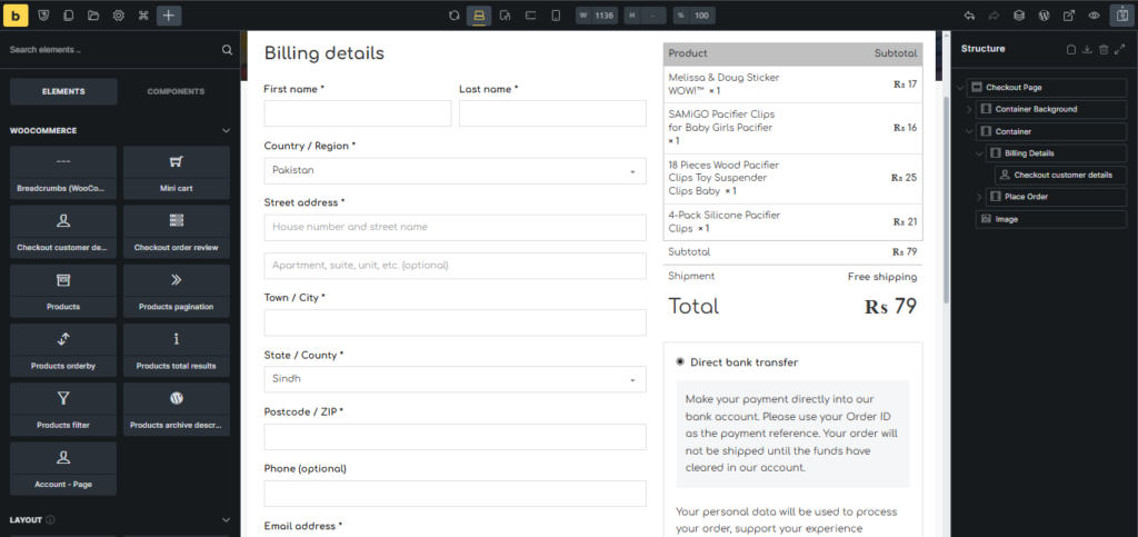 Advanced builders like Bricks Builder or Elementor Pro provide dedicated, granular checkout widgets that you can drag and drop anywhere on the screen.