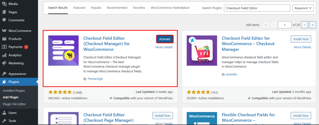 - Go to Plugins > Add New, search for “Checkout Field Editor by ThemeHigh”, and install the free version.