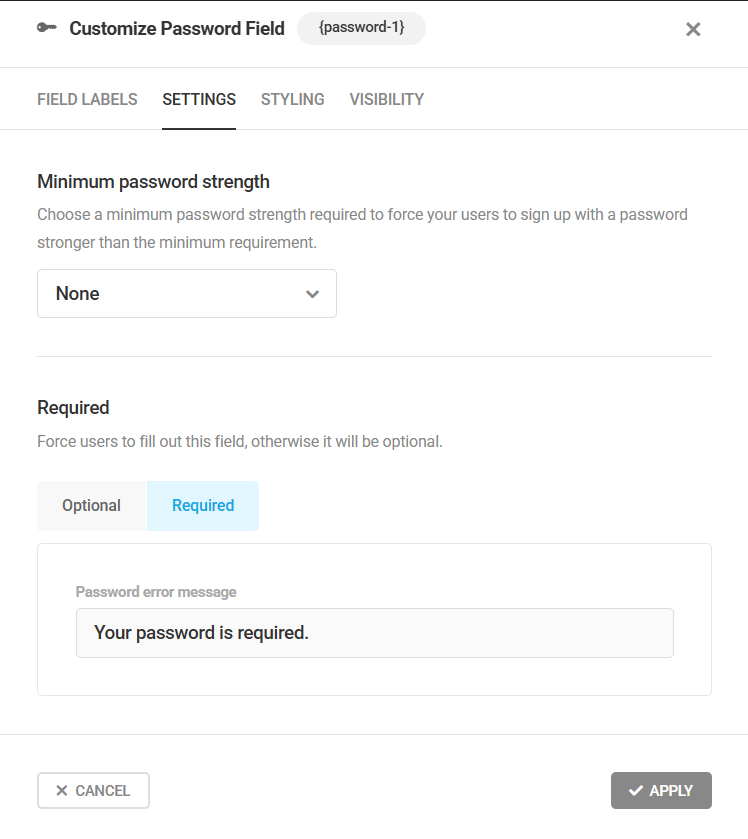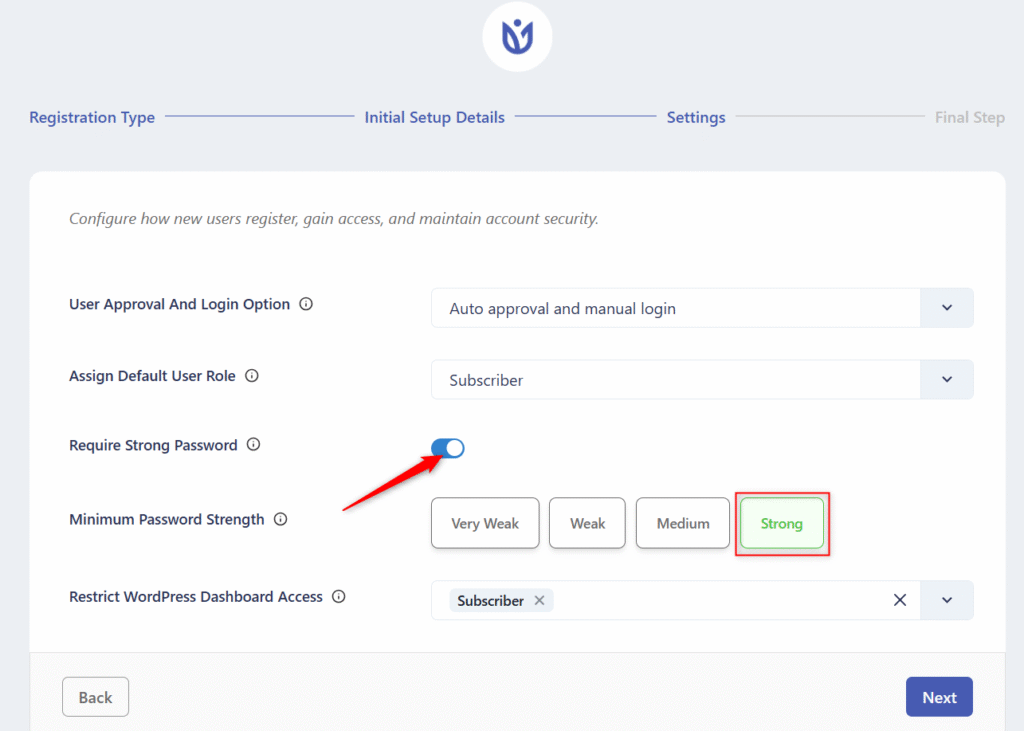 The third step in the setup is Settings — there, you can enable the Require Strong Password option and set the Minimum Password Strength to Strong. This will require users to use complex passwords when creating their accounts using the registration forms generated by this plugin.