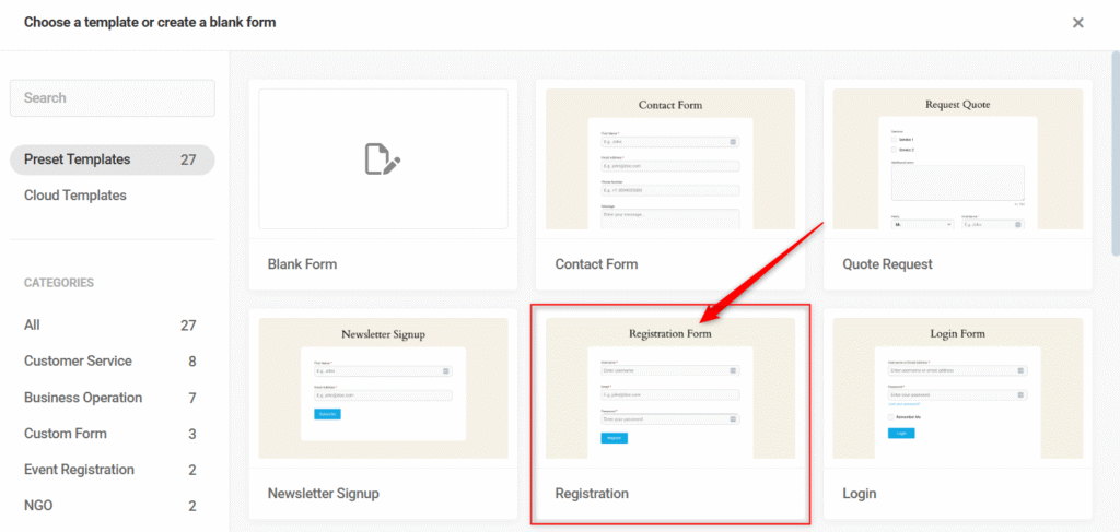 Forminator comes with some form templates to speed up your form-building process. You can choose to charge a blank form to start from scratch or select a template.
