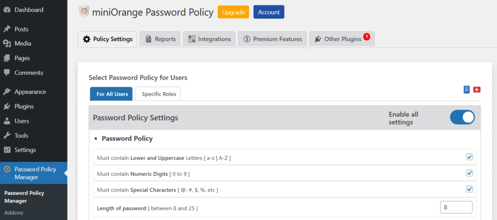 The Password Policy Manager is a WordPress plugin that allows you to enforce the use of strong passwords when creating an account in WordPress.
