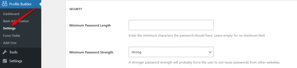 Then go to Profile Builder > Settings > General Settings. Scroll down to the Security section, enter the minimum password length, and change the minimum password strength from Very Weak to Strong.