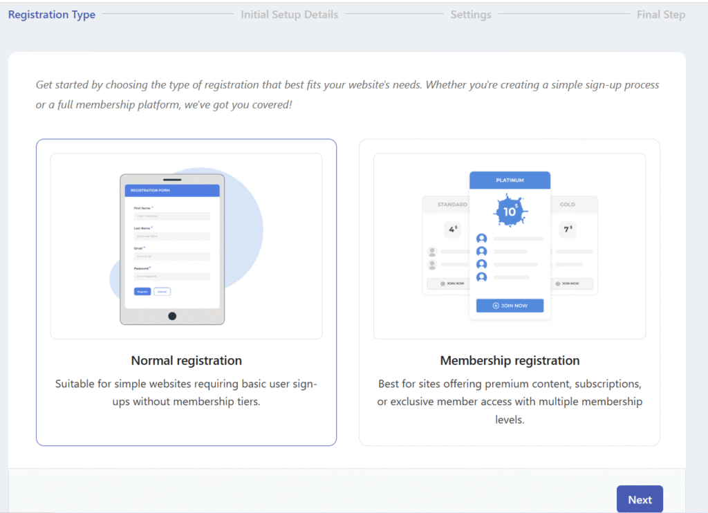 In the first step, you will be required to choose a registration type. You can choose either normal registration or membership registration. The second step involves the plugin creating the necessary pages.