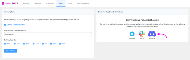• Alerting: FluentSMTP integrates with Discord and Telegram via webhooks. Under the Alerts tab, you can configure these so that failure data is sent to your preferred chat app immediately.
